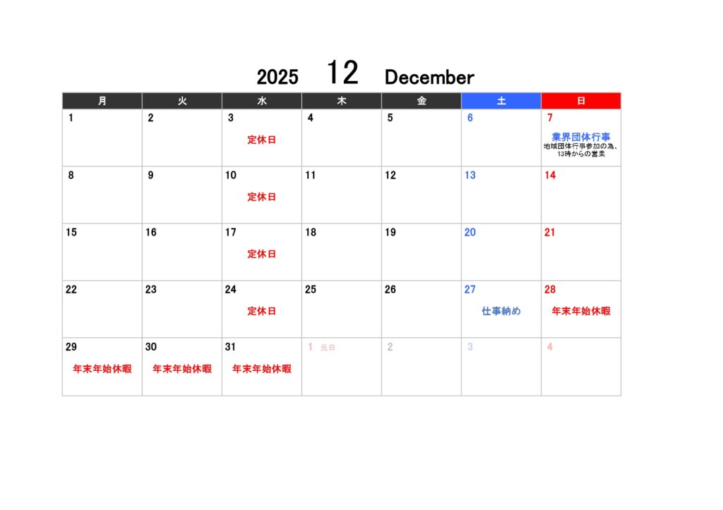 2025年12月の定休日及び年末年始休暇は以下の通りとなります。