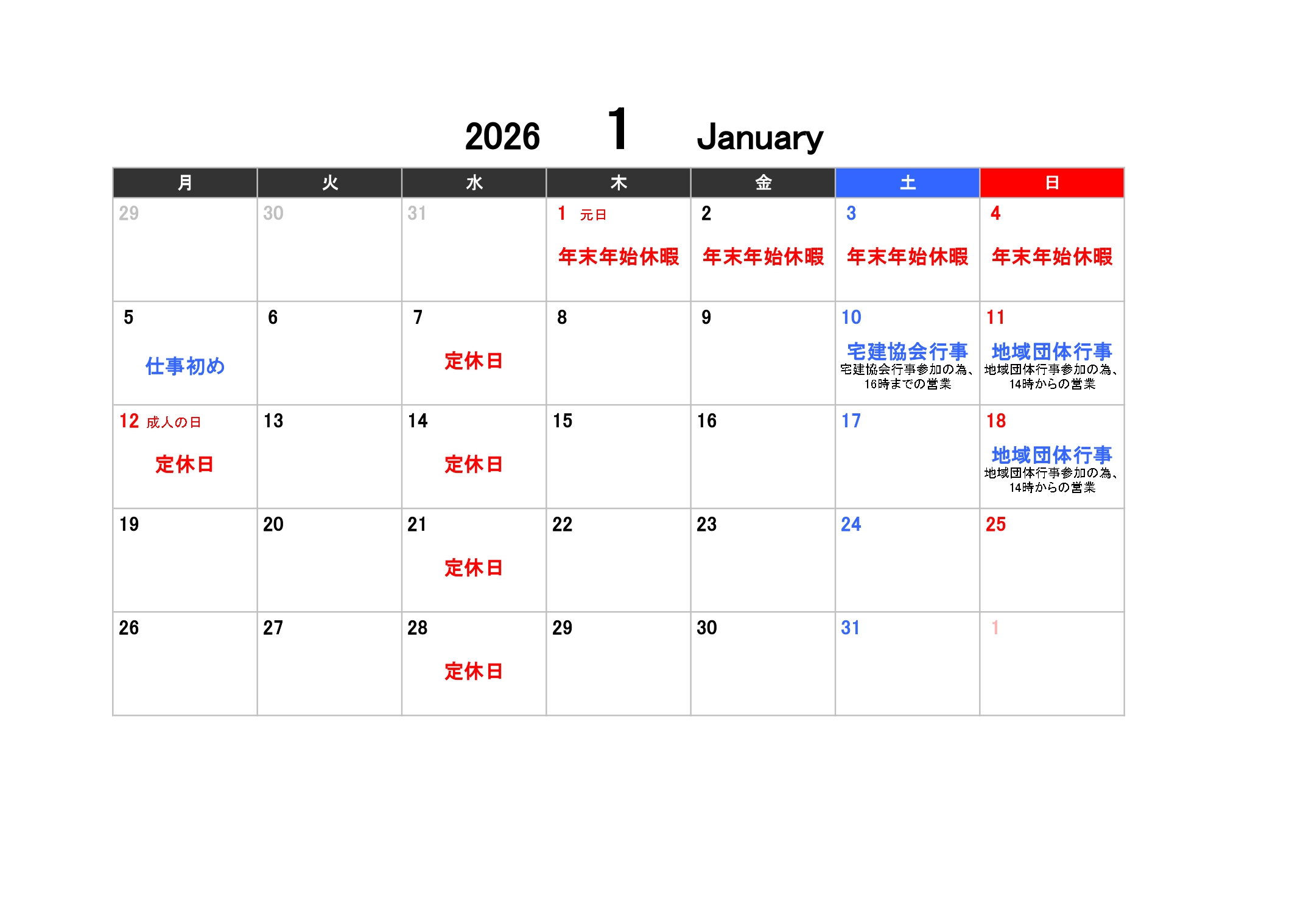 2026年1月 定休日のお知らせ 更新日: 2025年12月18日 拝啓、ますますご清栄の事とお慶び申し上げます。平素は格別のご配慮を賜り厚くお礼申し上げます。 2026年1月の定休日は以下の通りとなります。 お客様にはご迷惑をお掛け致しますが、何卒ご容赦賜りますようお願い致します。 林田商事株式会社 代表取締役 林田 隆志 【1月定休日】 営業時間 9:30 ~ 18:00 定休日 水曜、祝日 ■休日カレンダー2026年1月