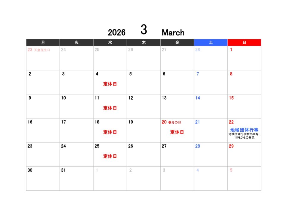 2026年3月 定休日のお知らせ 更新日: 2026年2月16日 拝啓、ますますご清栄の事とお慶び申し上げます。平素は格別のご配慮を賜り厚くお礼申し上げます。 2026年3月の定休日は以下の通りとなります。 お客様にはご迷惑をお掛け致しますが、何卒ご容赦賜りますようお願い致します。 林田商事株式会社 代表取締役 林田 隆志 【3月定休日】 営業時間 9:30 ~ 18:00 定休日 水曜、祝日 ■休日カレンダー2026年3月